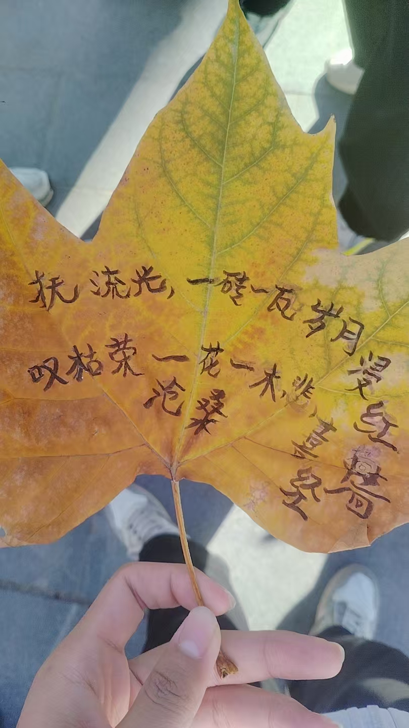 落叶是秋日光影里的诗意馈赠,更是承载心声的专属信使。活动中,同学们怀揣着各自捡拾的专属落叶相互分享。他们以灵动笔触为叶片添注独特心绪,让藏在心底的感悟、期许与憧憬,在叶脉间轻轻流淌。随后,大家将这一张张“心声叶笺”粘贴在心愿板上,娓娓道来叶笺背后的故事与思索,让每一片落叶都成为青春心境的鲜活注脚。