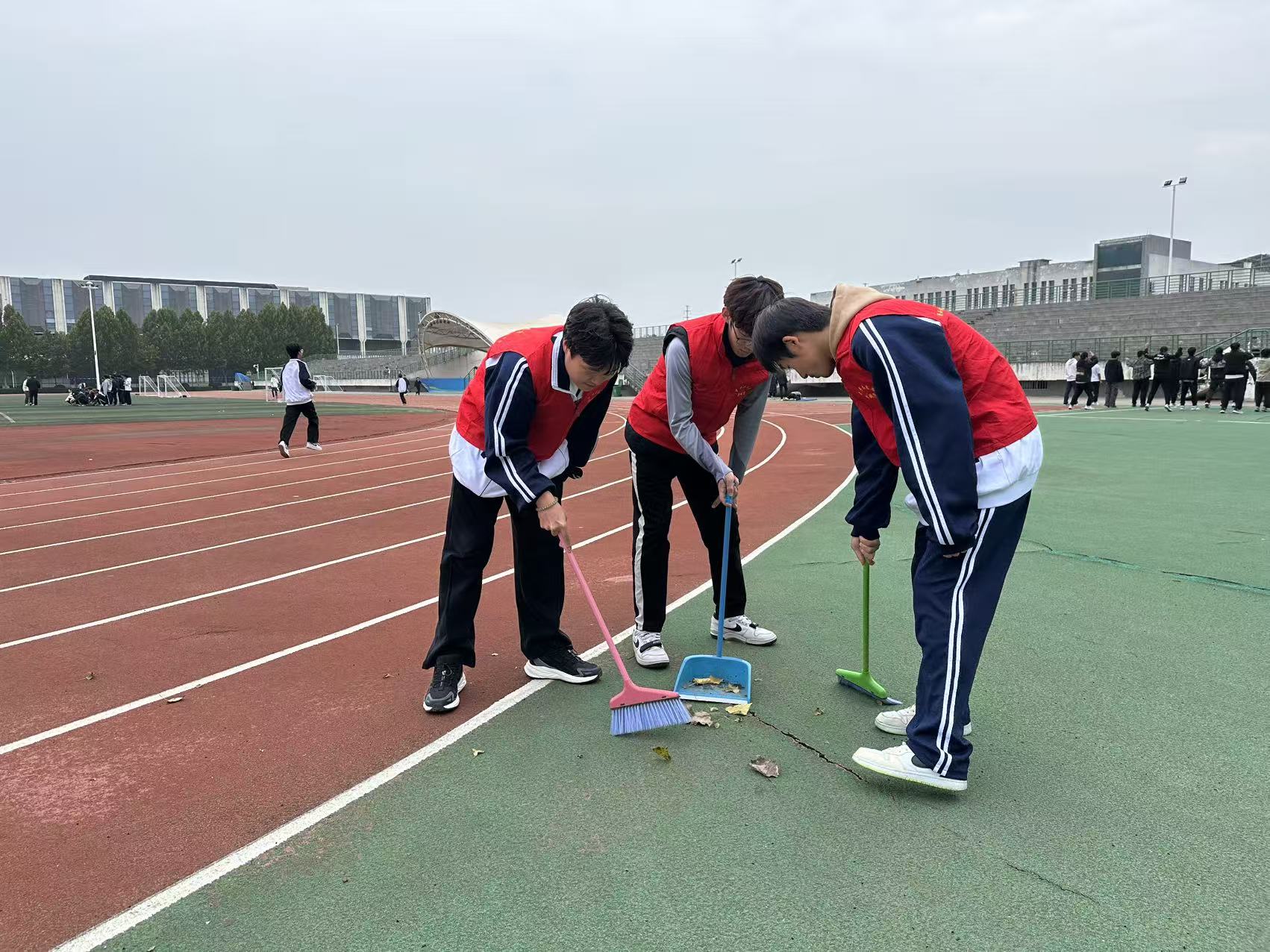 深秋时节,校园主干道、广场落叶堆积,既影响环境美观,也潜藏雨天湿滑的安全隐患。所以12名团支部成员准时集结,按“主干道组”“休闲区组”分工协作:前者重点清理教学楼周边、校门口道路落叶,避免堆积影响校园风貌;后者细致清扫操场、广场及长椅区域杂物,兼顾卫生死角清洁。从确认工具、划分路段到收尾整理物资,成员们干劲十足,原本落叶杂乱的区域很快恢复整洁,。