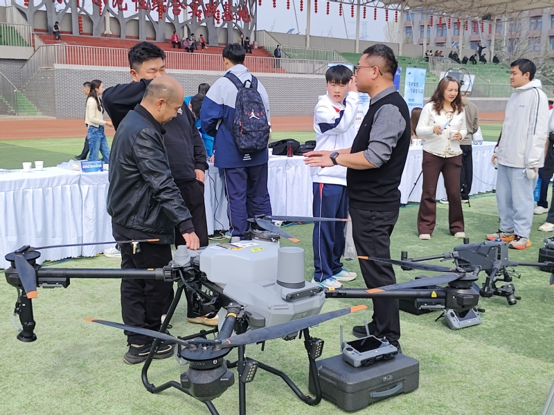 活动现场,黎飞明、朱鹏程两位老师与无人机3241班刘仕佳、吴向阳两位同学通过实物展示、专业讲解、现场答疑等多种形式,直观呈现无人机精准喷洒、智慧农业等前沿技术应用,充分展示了遥感测绘、低空植保与现代农业深度融合的实践成果,吸引众多观众驻足观看、互动体验。